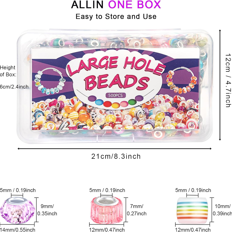 - 【500 Pcs European Large Hole Beads】Amazingly Large Number Of Large Hole Beads And Colorful Colors,A Must For Diy Charm Jewelry Making Lovers. 500 Pieces 14 Colors European Craft Beads (5mm Hole) including 420 regular large hole beads and 80 large hole beads without metal Metal clasps. Assorted Beautiful Colors And Styles To Meet Your Various Diy Jewelry Making Needs.
