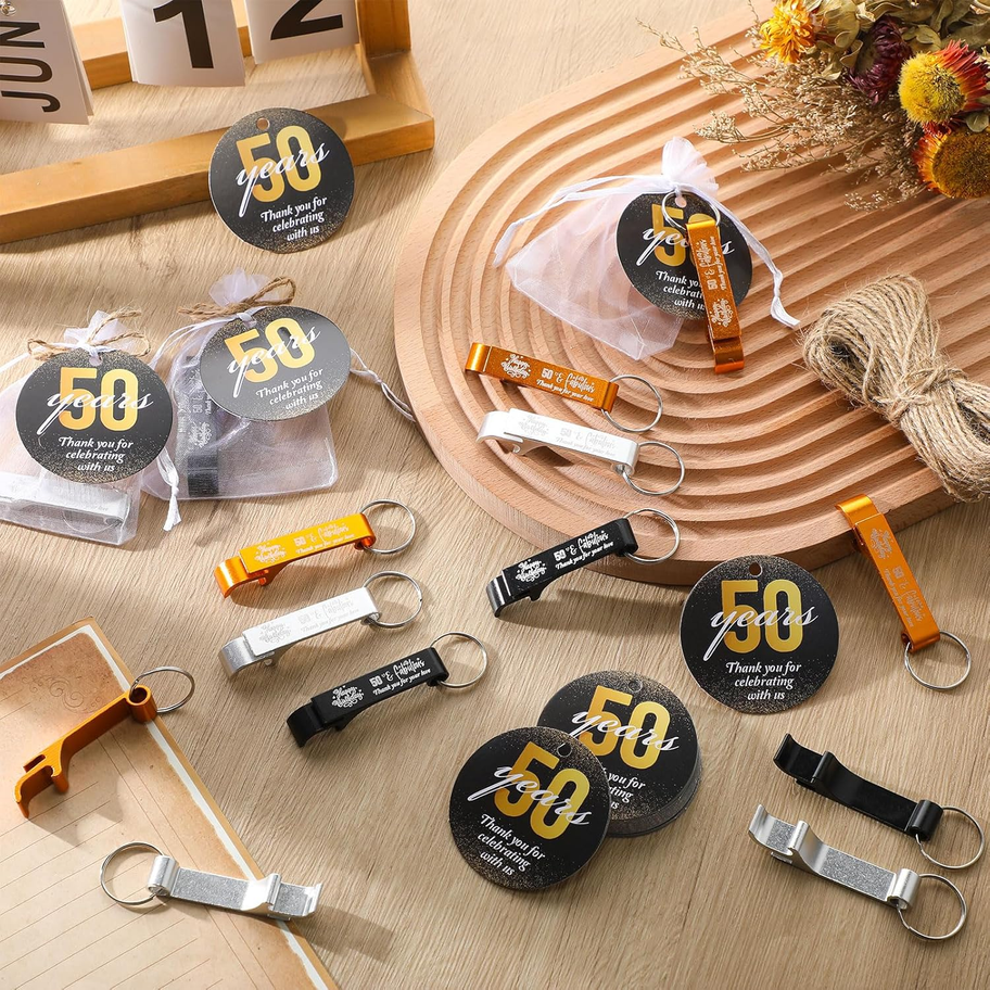 - Package Content: you can get 54 pieces of bulk 50th birthday bottle openers, 54 pieces of thank you cards, 1 roll of rope and 54 pieces of white organza bags in this package, enough and eye catching, a nice combination to meet your decorative needs at your birthday party