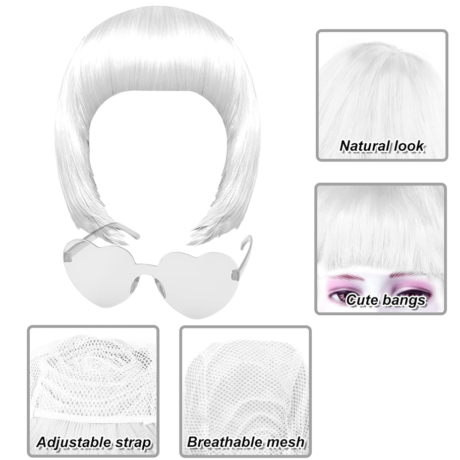 White Short Bob Wig and Sunglass Set, Neon Colored Wigs Sunglass Pack Costume Co